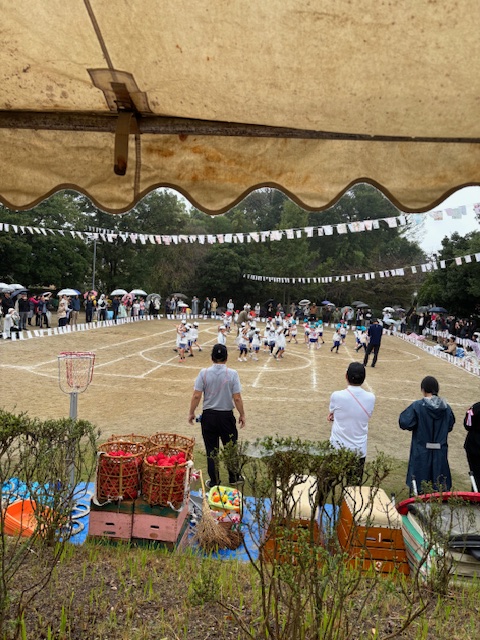 5歳児さんの親子競技の途中で、雨が強くなり、中止、終了 としました。