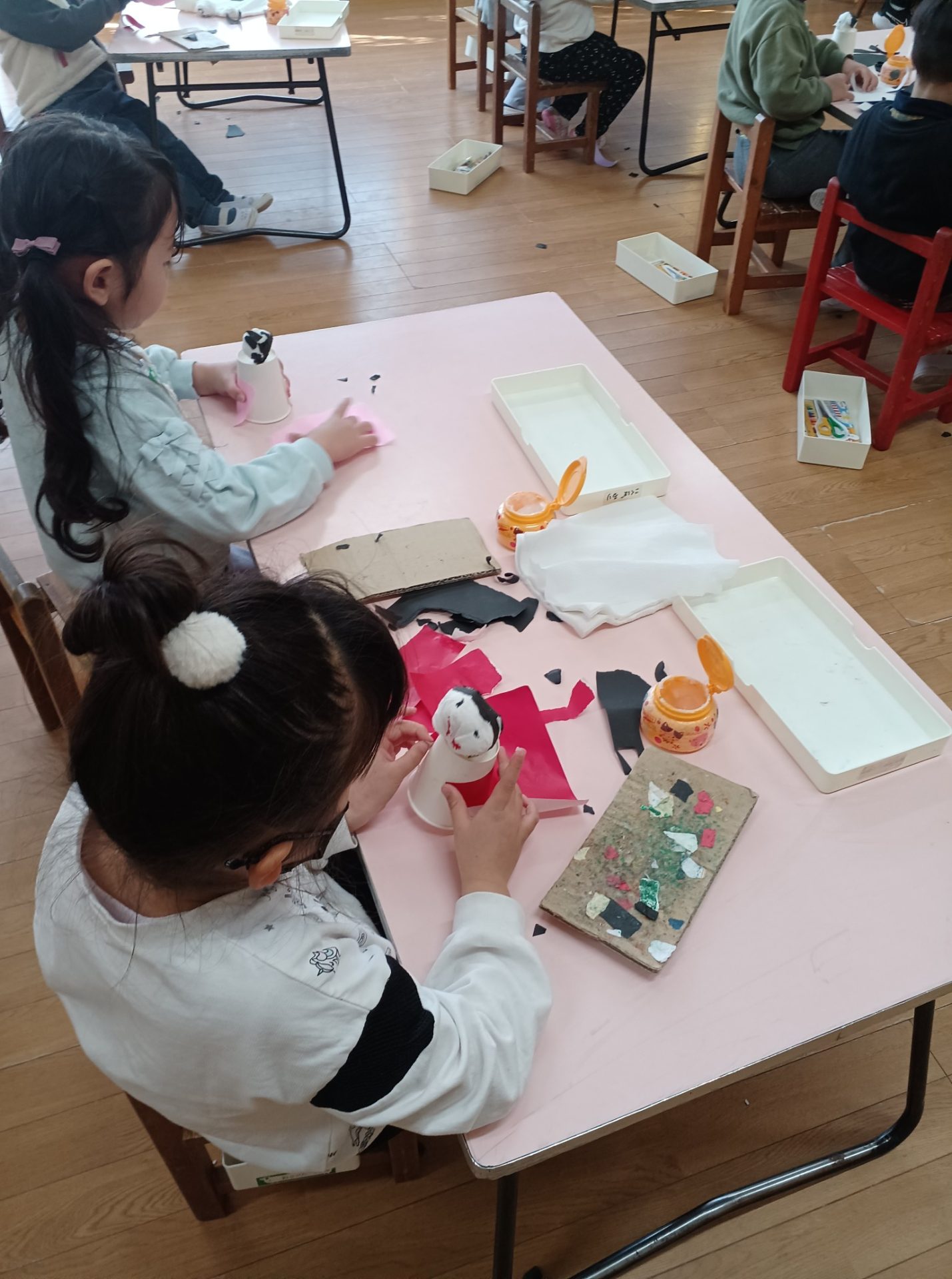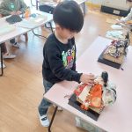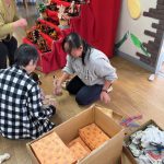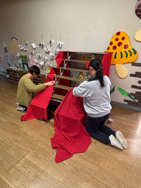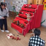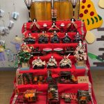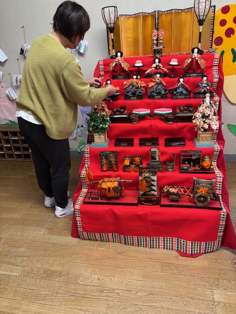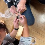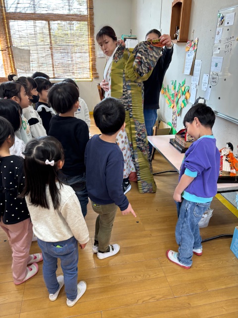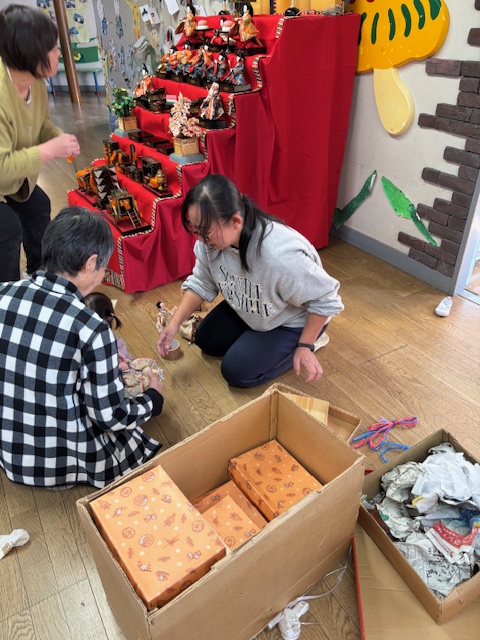 烏帽子の紐を結んで、頭に烏帽子をのせます。