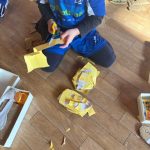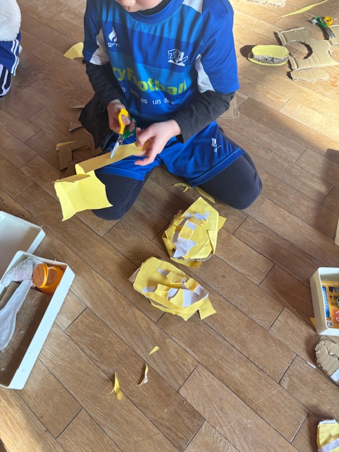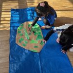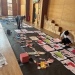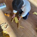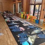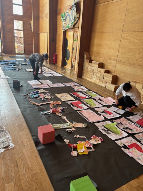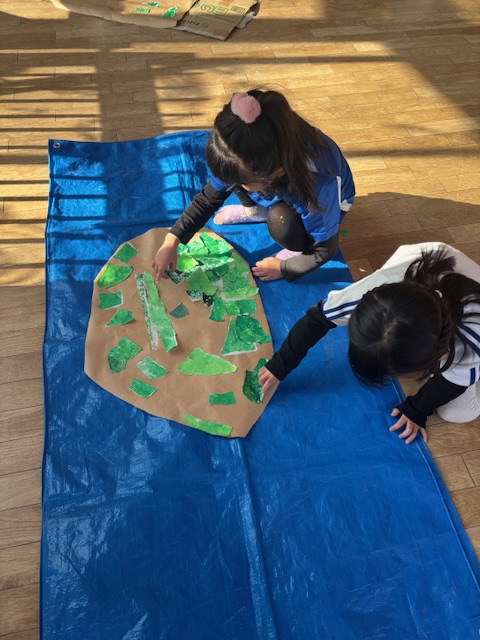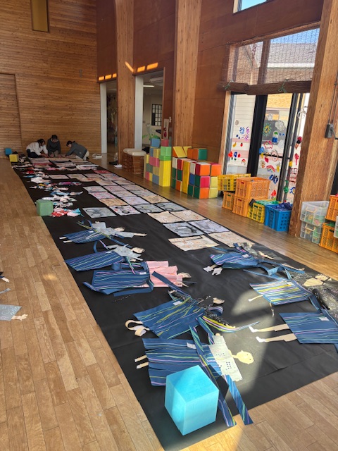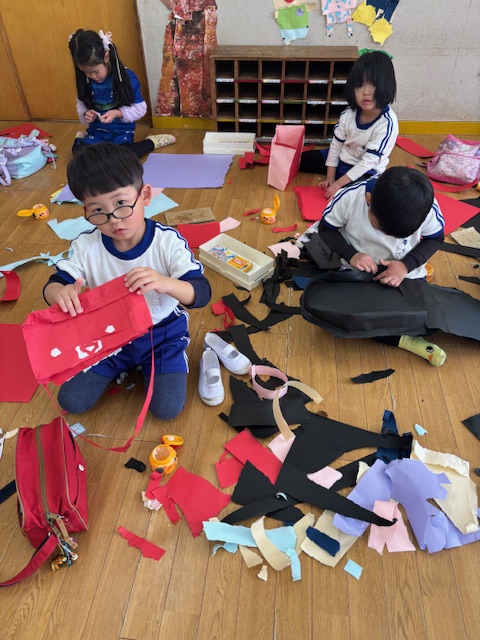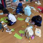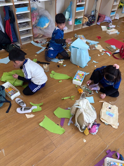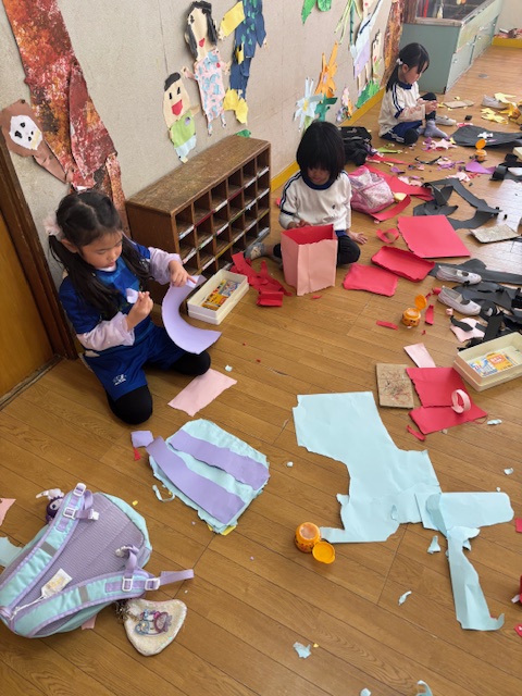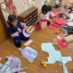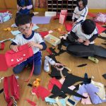 火曜日 さて、今日は? 4歳児さんは 自分のカバンを作りました。 そして、 昨日の松羽目 少し、足らないので、 小さいのを作りました。 5歳児さんは 草履 の続き。 午前中 体操もありました。 午後は ボール遊び。 先生たちは、 作品展の展示の準備 壁面に飾る絵です。 こんな感じの今日でした。 « 作品展が近くなり