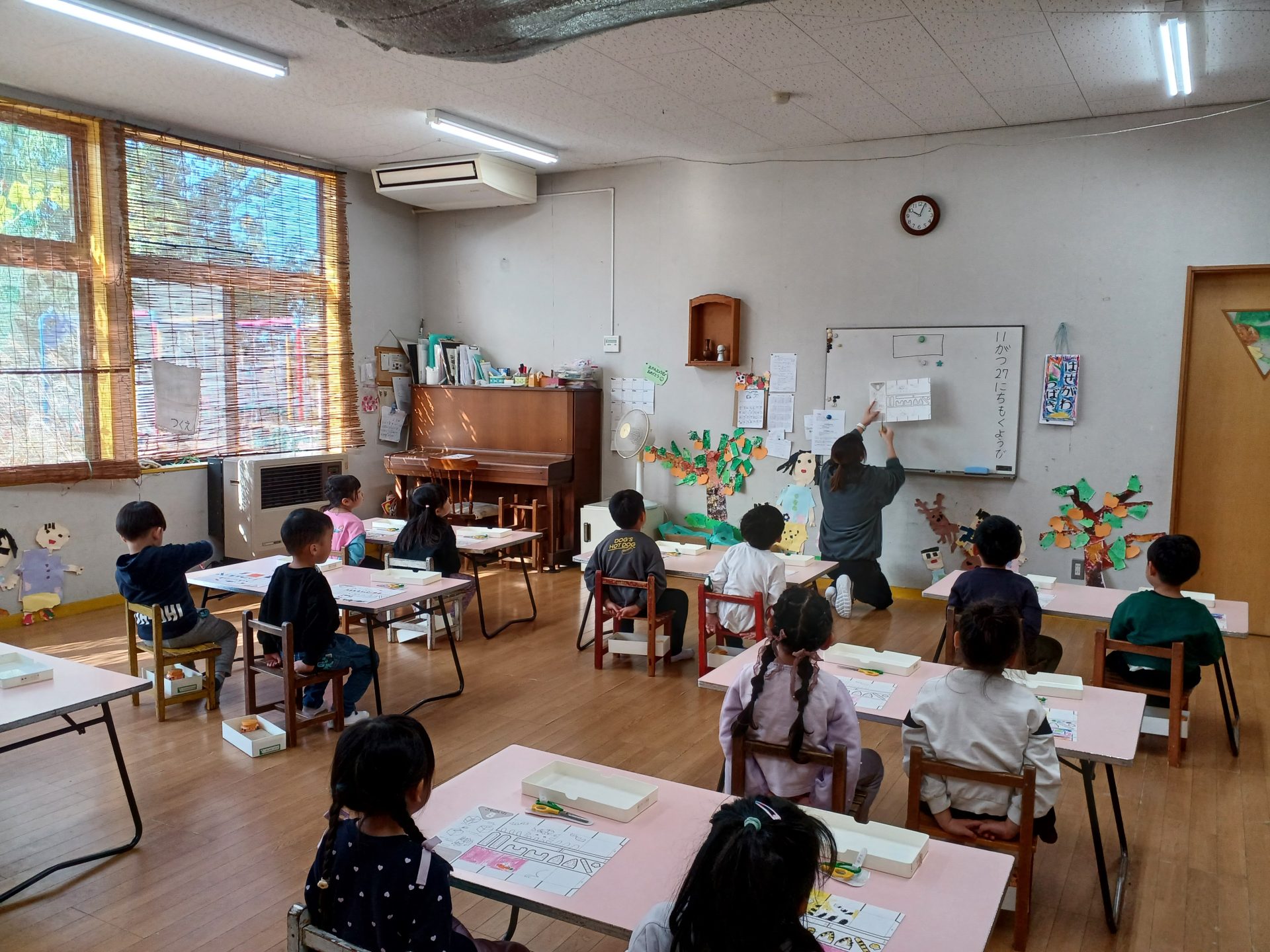 さて、今日は? 成道会が終わり、ホツト一息の幼稚園。 今日は、何をしたのかな? 4歳児さんは、 ワンダークラフト。 鳥を作りました。 ハサミで切り。 絵具で、色を付けました。 そして、 ホールで遊びました。 5歳児さんは 少しだけ、ひらがな を 並べてみました。 そして、ちえのみ をしましたよ。 こんな感じの 今日でした。
