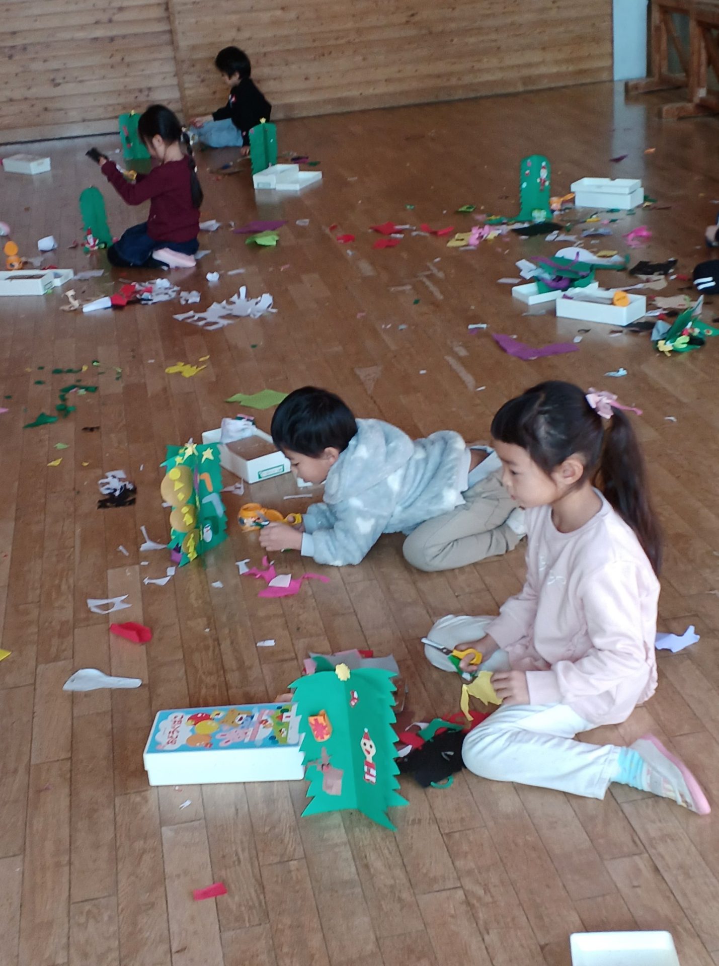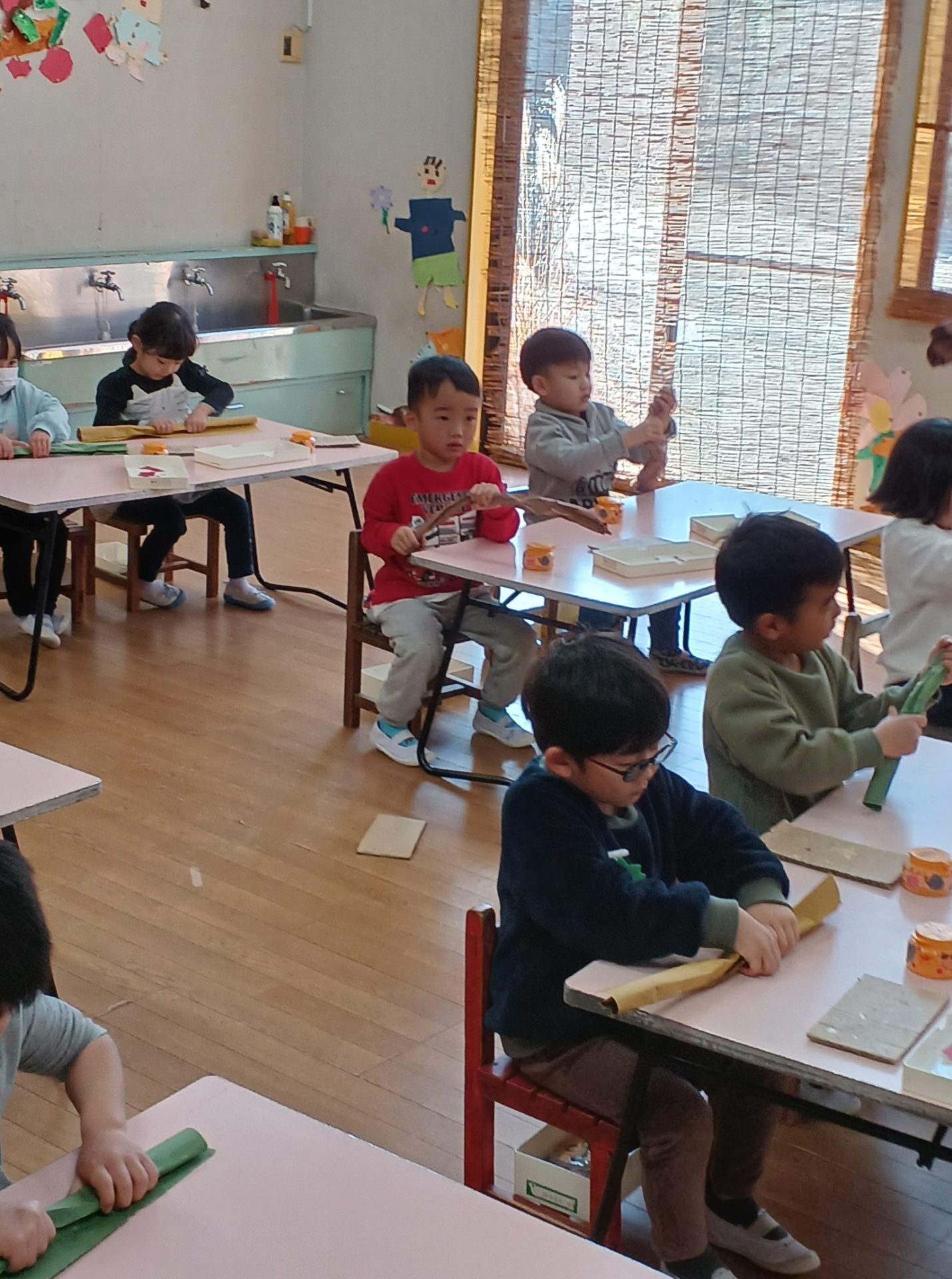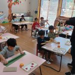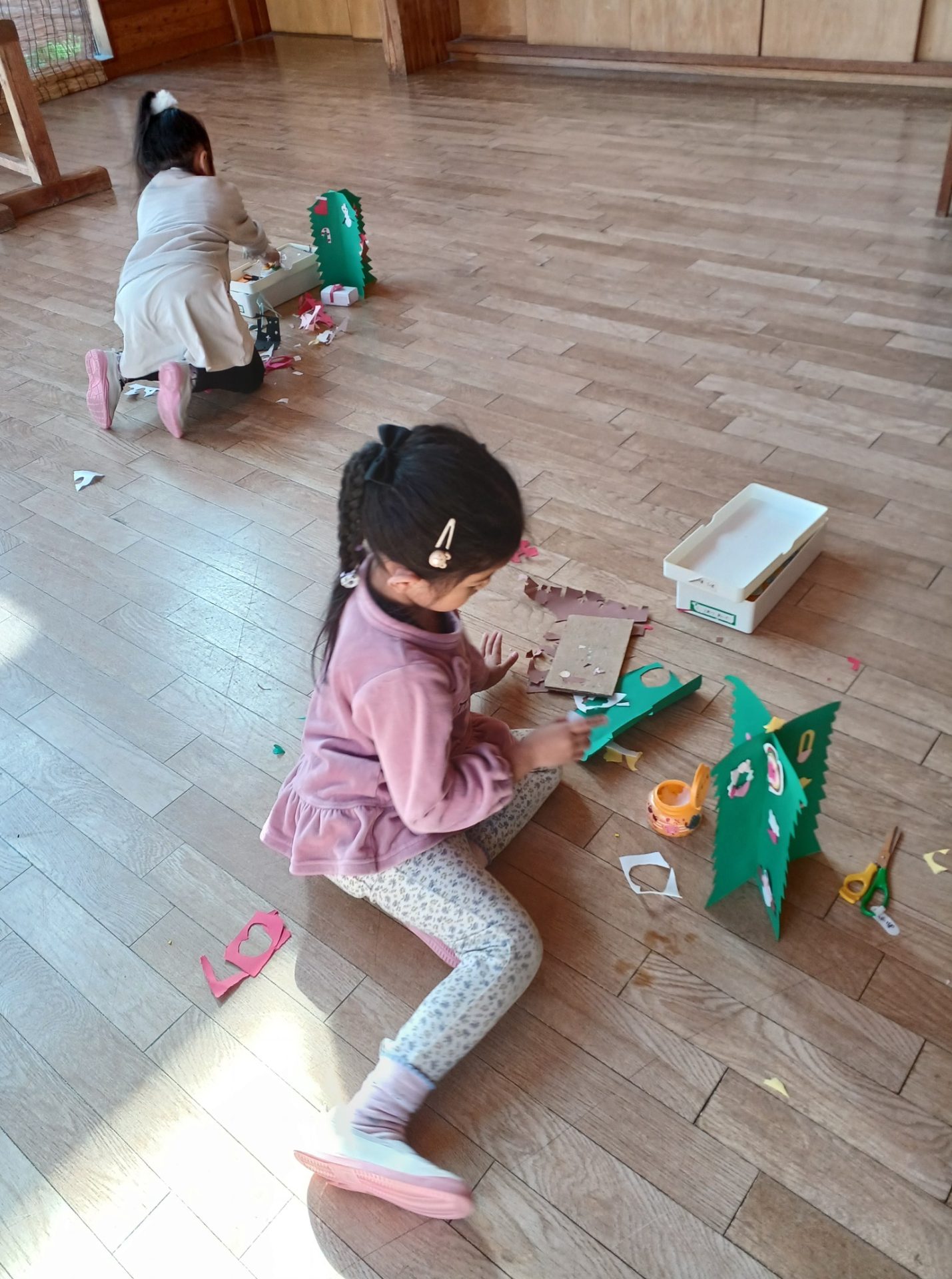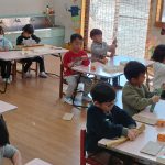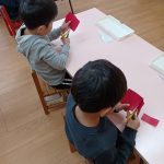金曜日 さて、今日は? 4歳児さんは クリスマスツリーを 切りました。 切ったツリーに パスタやボタン モール等をつけました。 素敵なツリーができました。 5歳児さんは、ひらがな ひらがな も 終わりに近くなりました。