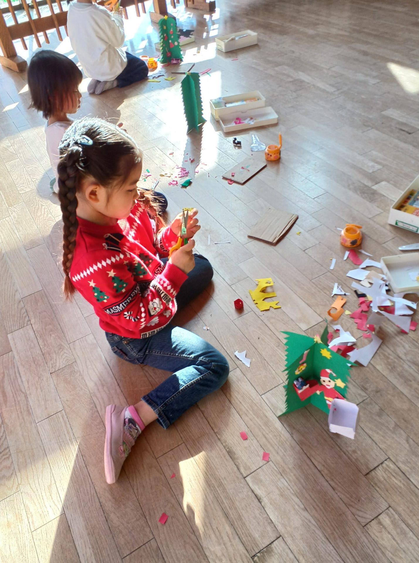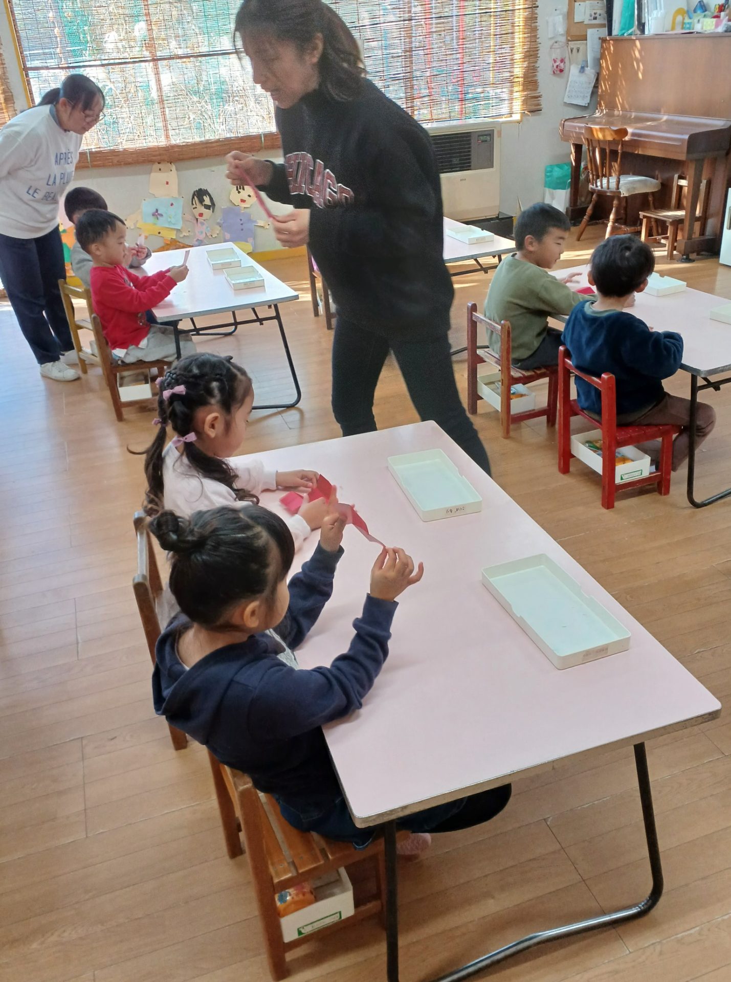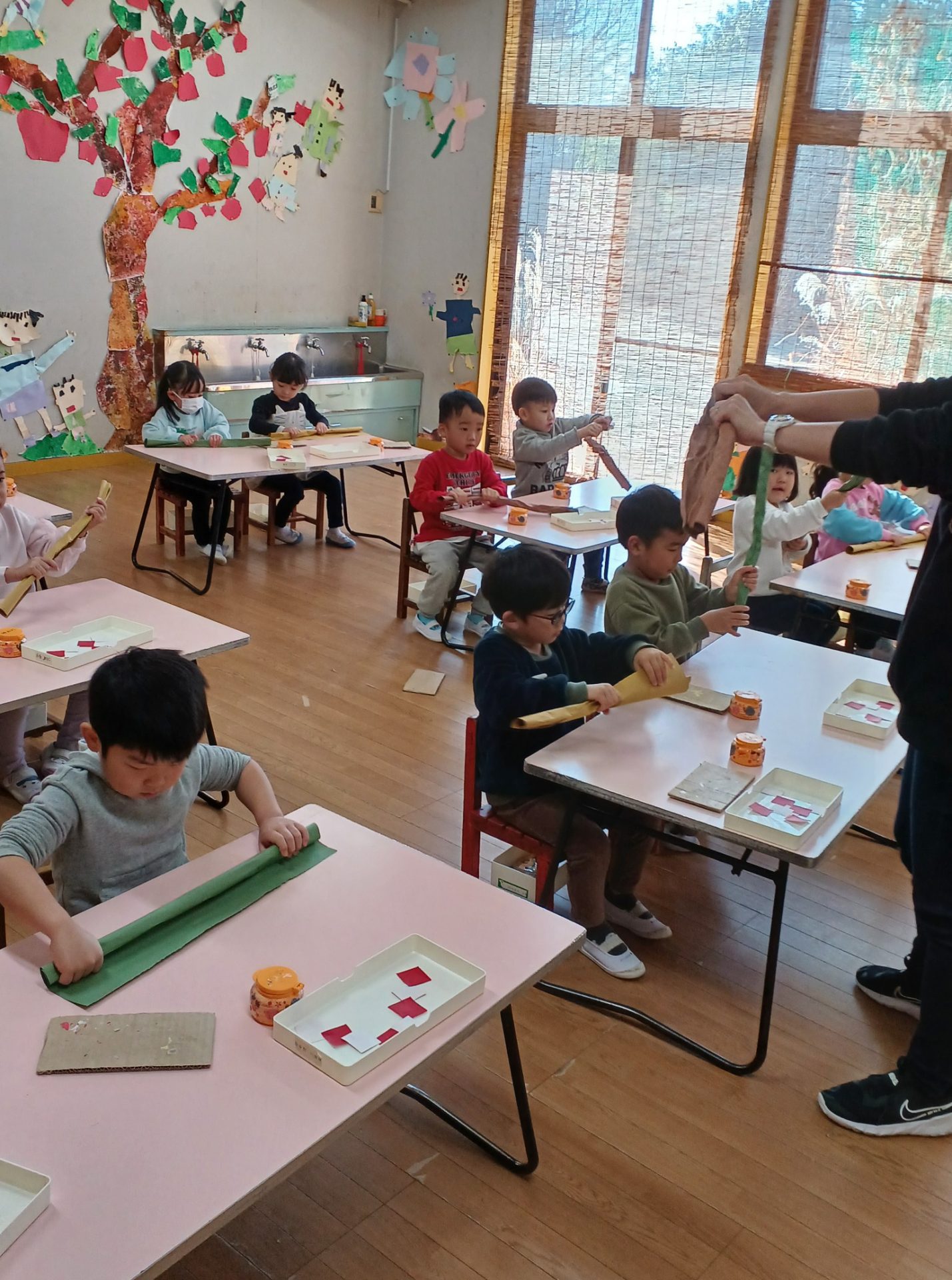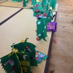 金曜日 さて、今日は? 4歳児さんは クリスマスツリーを 切りました。 切ったツリーに パスタやボタン モール等をつけました。 素敵なツリーができました。 5歳児さんは、ひらがな ひらがな も 終わりに近くなりました。
