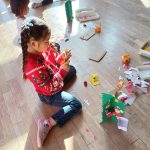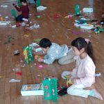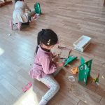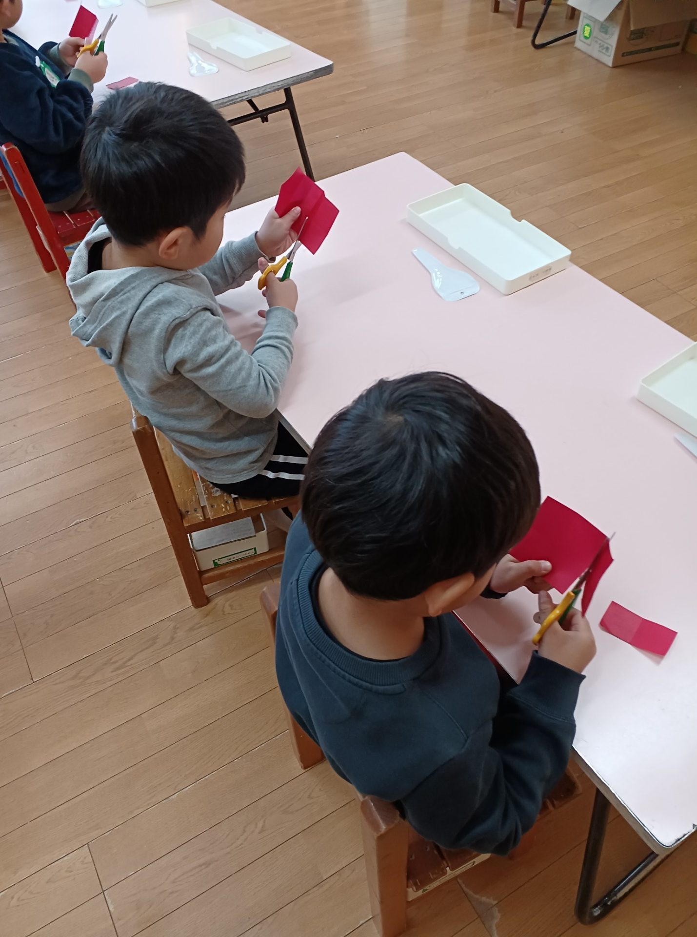 火曜日 さて、今日は? 4歳児さんは クリスマスツリー用の 松ボックリに ペンキで色をつけました。 それとは別に、 クリスマスリースを切りました。 そして リースにつける 飾りを作りました。 5歳児さんは、ひらがな です。 きょうは 火曜日 体操もしましたよ。 こんな感じの今日でした。